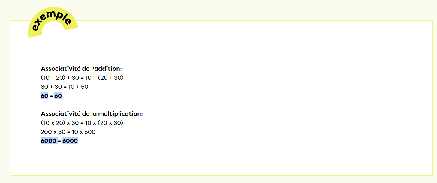 L'associativité est une propriété d'opération qui permet de modifier l'ordre des calculs en regroupant des termes entre parenthèses sans modifier le résultat de l'opération.