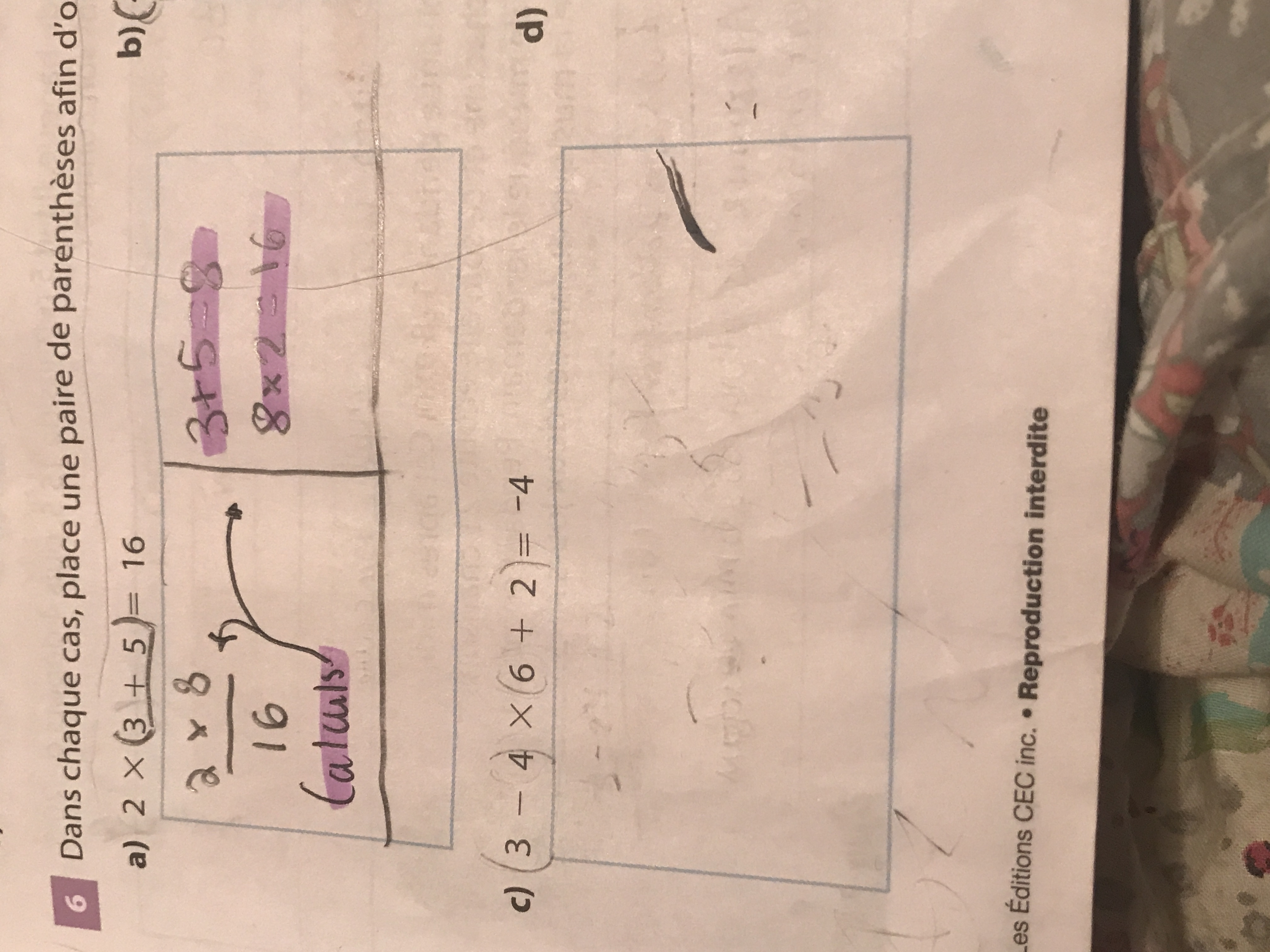 Pour ta première question, tu a bien réussi à mettre les parenthèses là où on te demandait de le faire. Cependant, sache que ça ne respecte pas les priorités des opérations (c'est surement ce qu'on voulait te faire voir, que ça ne donne pas le même résultat).