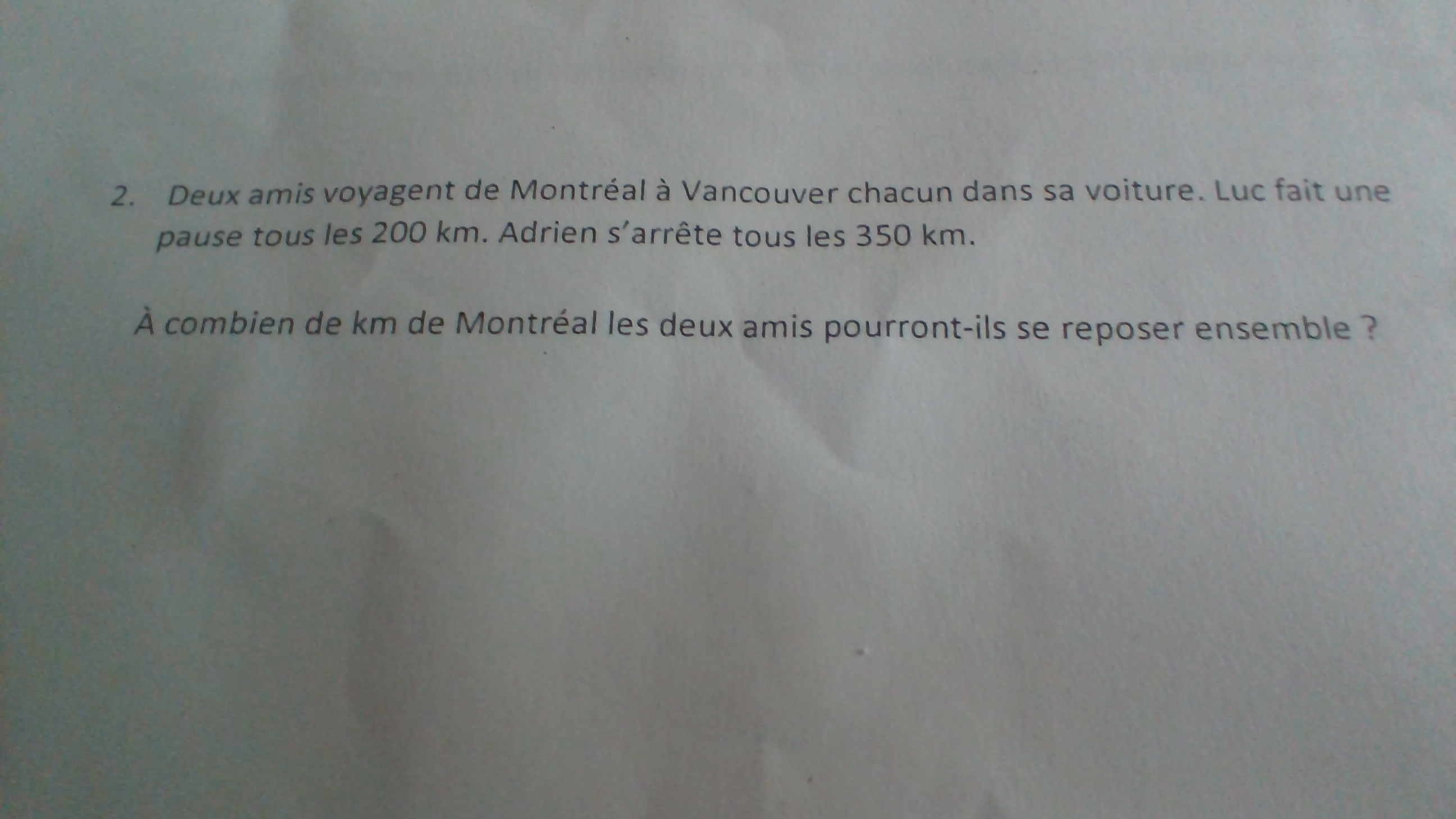 Nous savons que les deux amis se reposeront ensemble lorsqu'ils seront à une distance égale de Montréal. On cherche donc à trouver un multiple, représentant un endroit où les deux prendront une pause en même temps. Il s'agit ici de trouver le plus petit commun multiple des distances des deux amis.