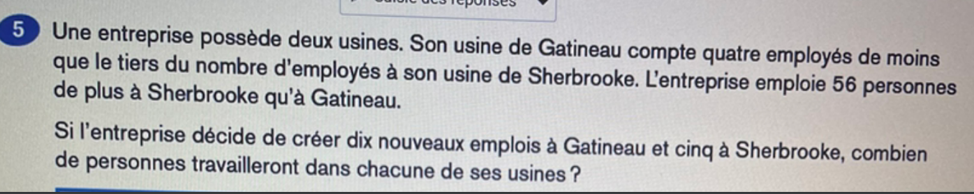 On sait qu'à Gatineau, il y a 4 employés de moins du tiers du nombre d'employés à Sherbrooke. Cela se traduit par l'équation suivante :