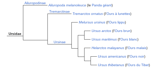 La taxonomie nous apprend que le grand panda et l'ours noir font partie d'une même famille (Usidae, la famille des ours), mais d'un genre différent. Cela signifie qu'ils ont eu un ancêtre commun de la famille Ursidae, mais que leur lignée c'est ensuite séparée pour donner deux genres distincts. Cette phylogénie des espèces d'ours représente cette situation: