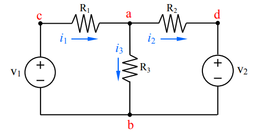 Il te faut scinder le circuit pour tes calcules. Comme le volt est une différence de potentiel, alors tu as besoin de calculer par borne. Puisque le potentielle est le même dans les deux sources, tu peux te dire qu'il est nul en dessous de la résistance 3. Tu peux donc utiliser la loi des courants au nœud :
