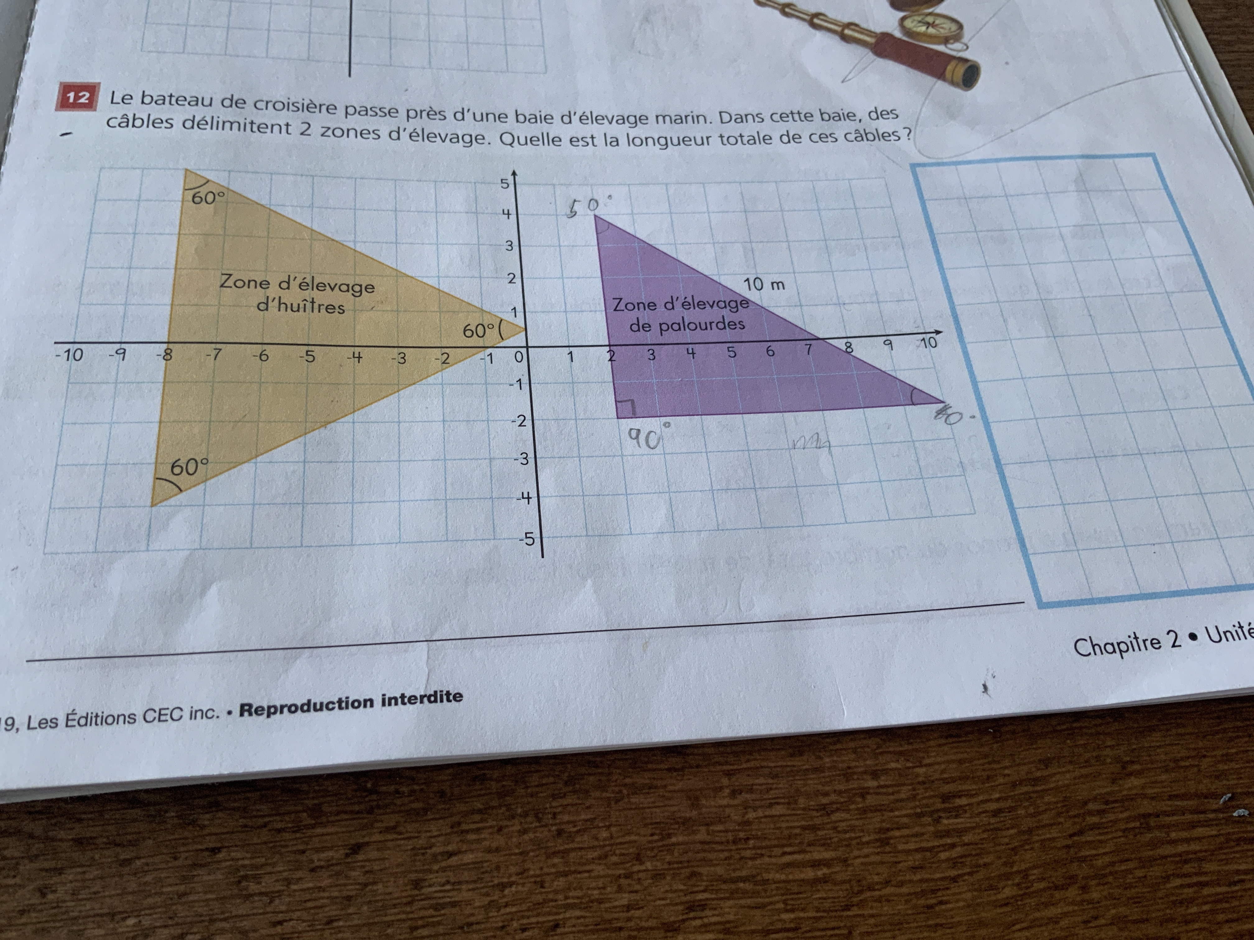 On te demande de calculer le périmètre de ces formes, puis d’additionner les deux périmètres pour trouver la longueur totale du câble. Tu peux te servir des graduations pour trouver le périmètre.