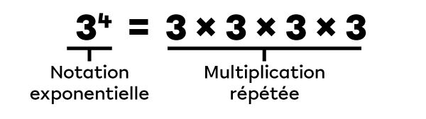 La multiplication répétée est le processus qu'on utilise pour déterminer le résultat. Plus de fois que non, tu vas devoir détailler ceci dans ton cahier, ton examen, tes exercices, etc.