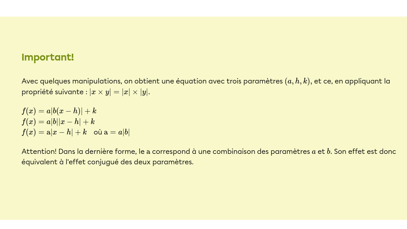 La forme canonique de la fonction valeur absolue est : f(x)=a∣b(x−h)∣+ k où a, b, h et k sont des nombres réels jouant le rôle de paramètres