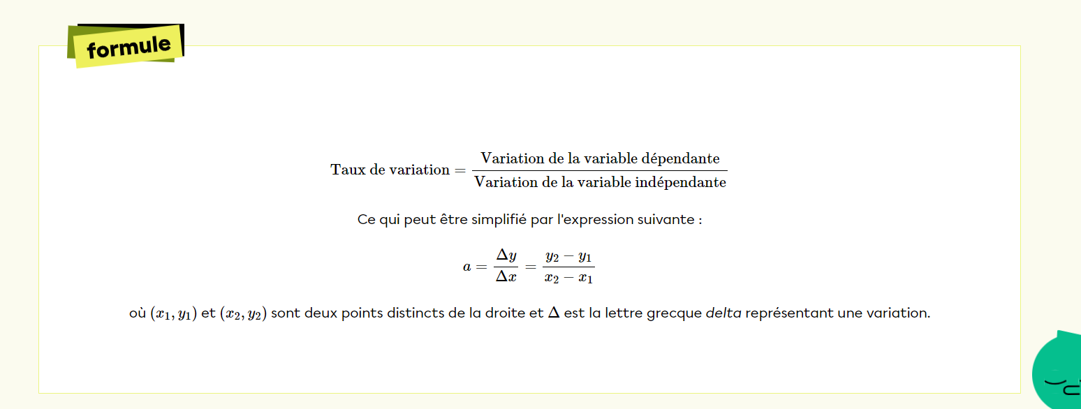 Pour plus d'information , je t'invite à lire notre fiche Alloprof sur le sujet qui donne des exemples et qui explique comment trouver le taux de variation
