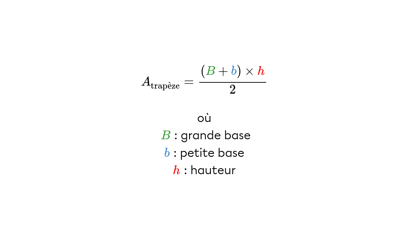 Tout d’abord, voici la formule qui permet de calculer l'air d'un trapèze.
