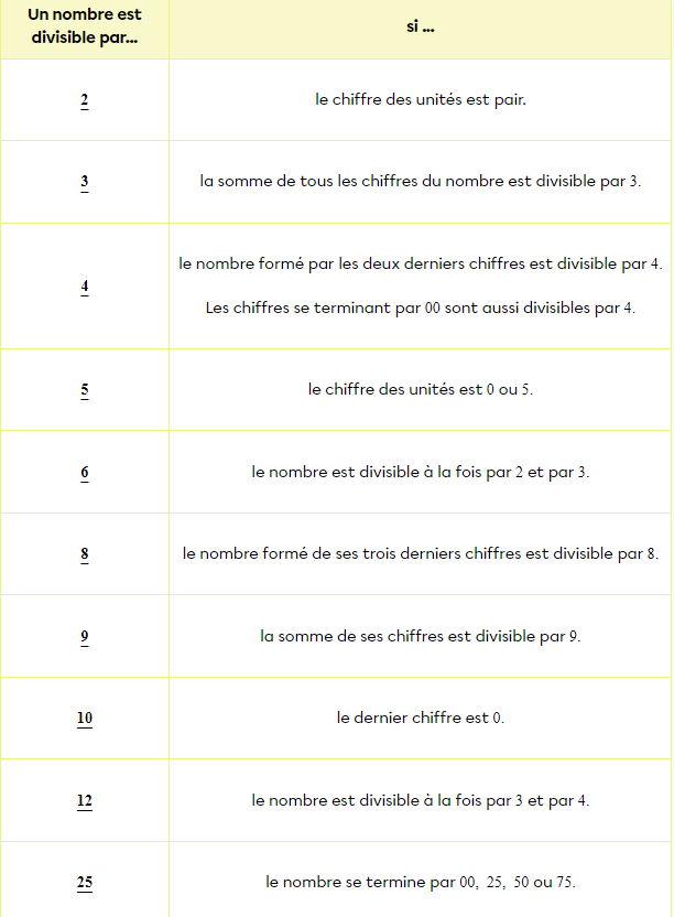 La fiche suivante te donne des trucs pour chaque critère de divisibilité : Les critères de divisibilité | Primaire | Primaire | Alloprof