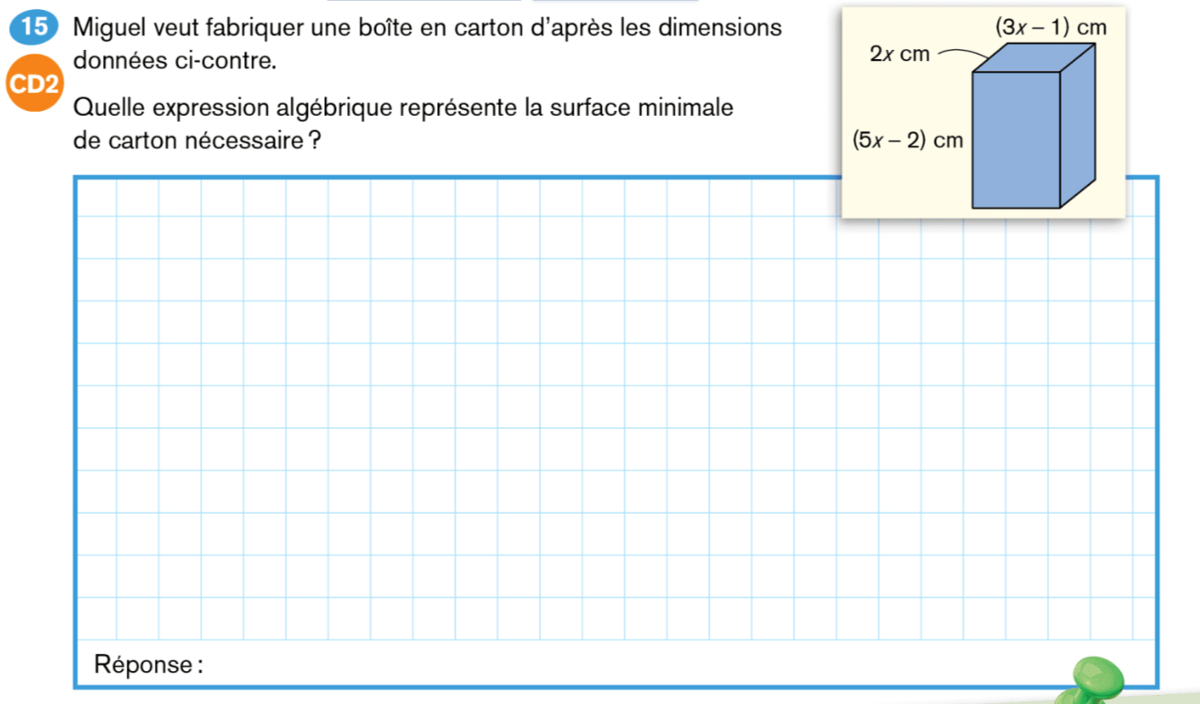 Tu dois calculer la surface totale de la boîte. Cela représente la quantité de carton minimum nécessaire.