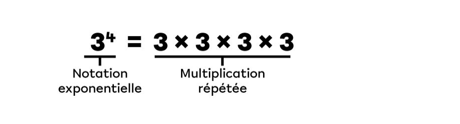 Par exemple, ici on a 3 exposant 4, ce qui signifie qu'on a 3x3x3x3.