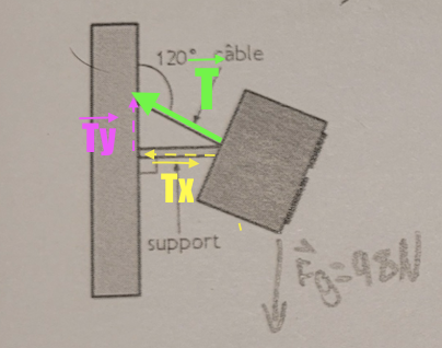 Ainsi, \( \vec{T}_y = 98 N\). Tu peux donc trouver la valeur de \( \vec{T} \) par rapports trigonométriques.