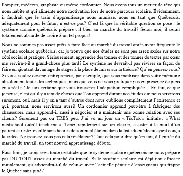 Je me pratique à écrire une courte lettre d'opinion (intro, 1 paragraphe, conclusion) pour les examens importants de 5e secondaire qui s'en viennent. Puis-je avoir un avis et une correction?