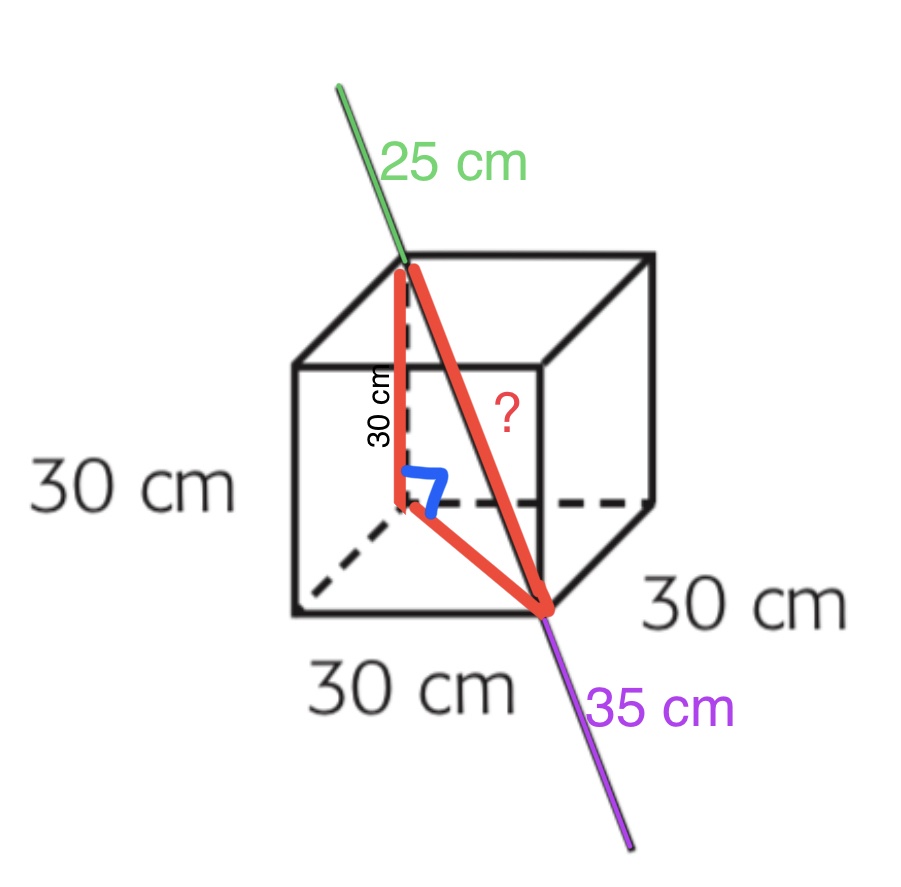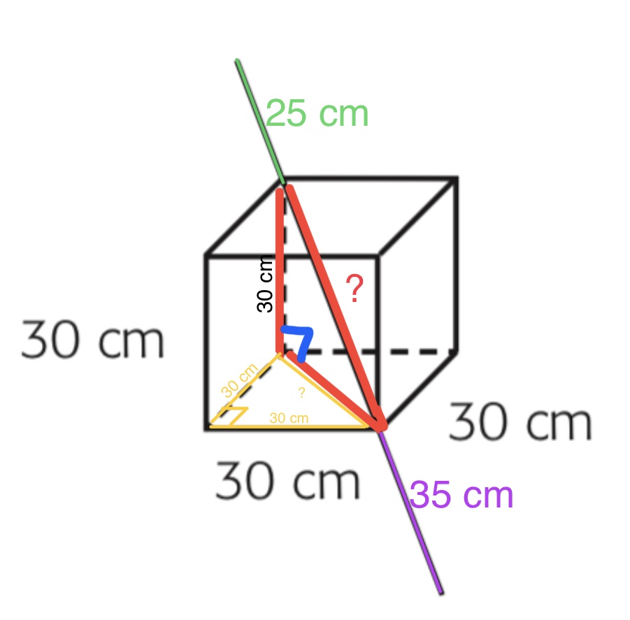 La longueur de la tige est divisée en trois parties, l’hypoténuse du triangle rectangle à l’intérieur du cube, le segment de 25 cm et le segment de 35 cm.