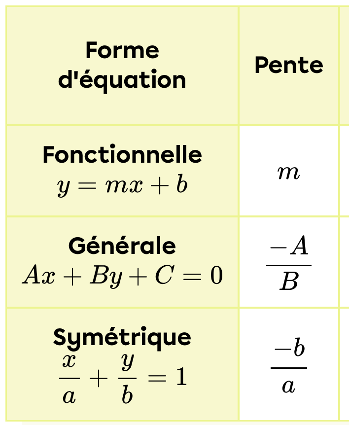 On sait que deux droites parallèles ont des pentes identiques. Tu dois donc trouver l’équation sous forme symétrique qui aura la même pente que l’équation sous forme générale. Pour ce faire, tu peux te servir du tableau suivant :