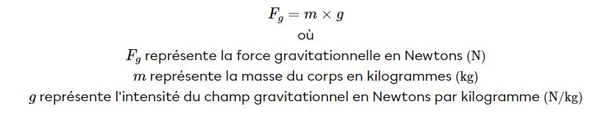 La force que la Terre applique sur chacun des corps est la force gravitationnelle. Voici la formule utilisée pour calculer cette force:
