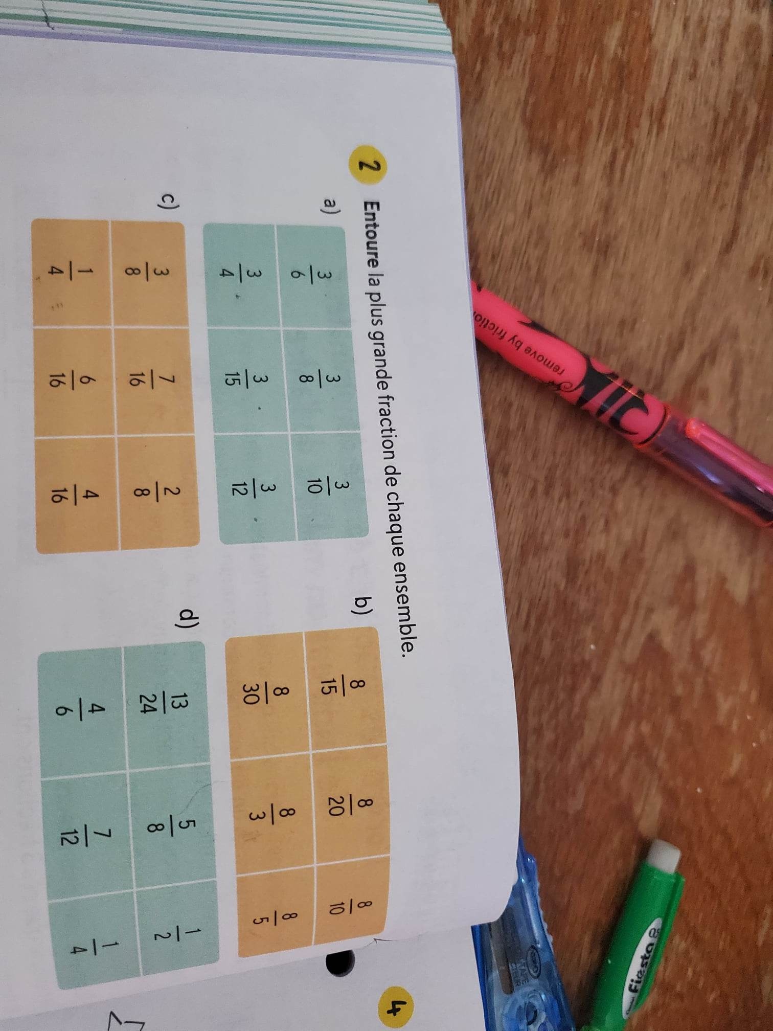 D'abord, quand il y a une fraction avec le même numérateur, la plus grande fraction sera celle qui à le plus petit dénominateur, car sa sera moins de morceau, mais plus gros. Ça c'est pour le a) et le b).