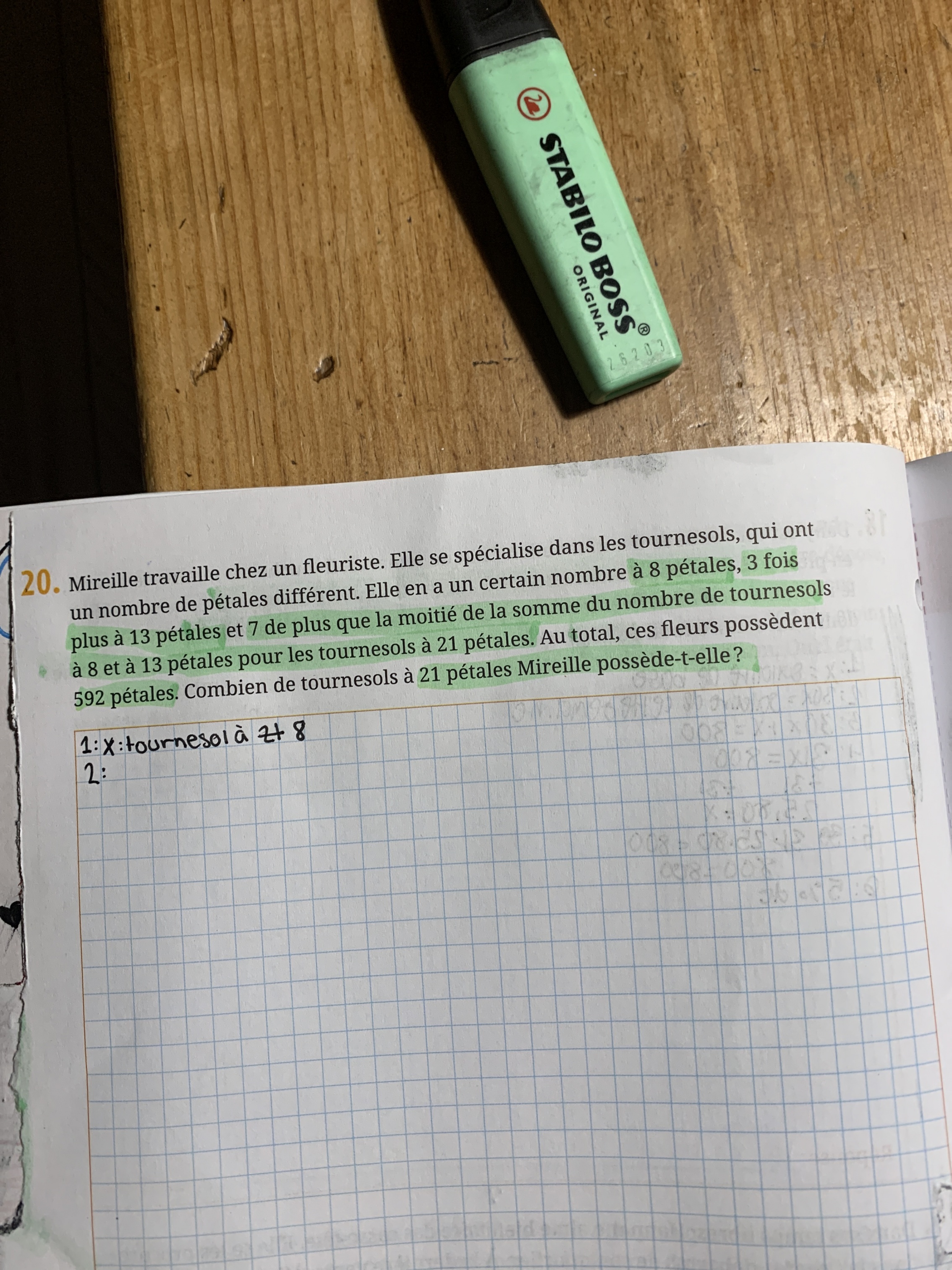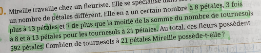 Tu as bien commencé en posant x comme étant le nombre de tournesols à 8 pétales.