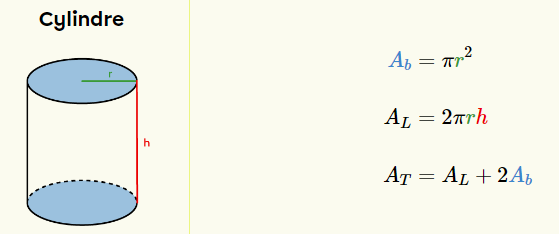 Pour l'aire totale du cylindre c'est l'aire latérale + 2x l'aire de la base