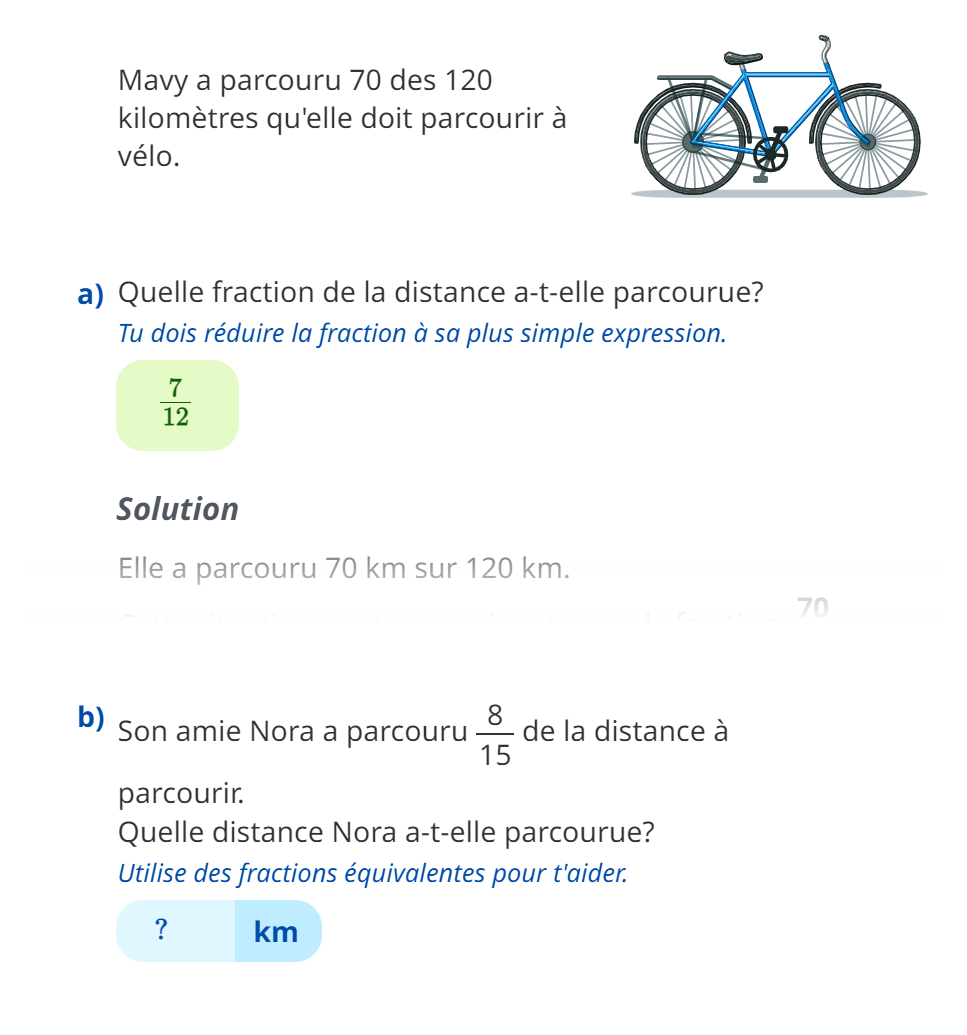Pour le b), tu dois calculer le 8/15 de 120. Pour ce faire, tu peux multiplier les deux nombres, comme ceci :