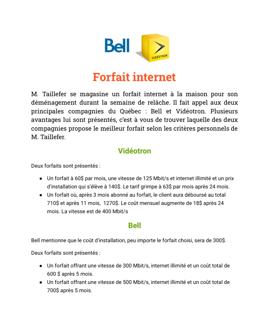 Selon les préférences de M. Taillefer, il devrait choisir le forfait de Vidéotron offrant une vitesse de 400 Mbit/s, internet illimité et un coût total de 710$ après 3 mois et de 1270$ après 11 mois.