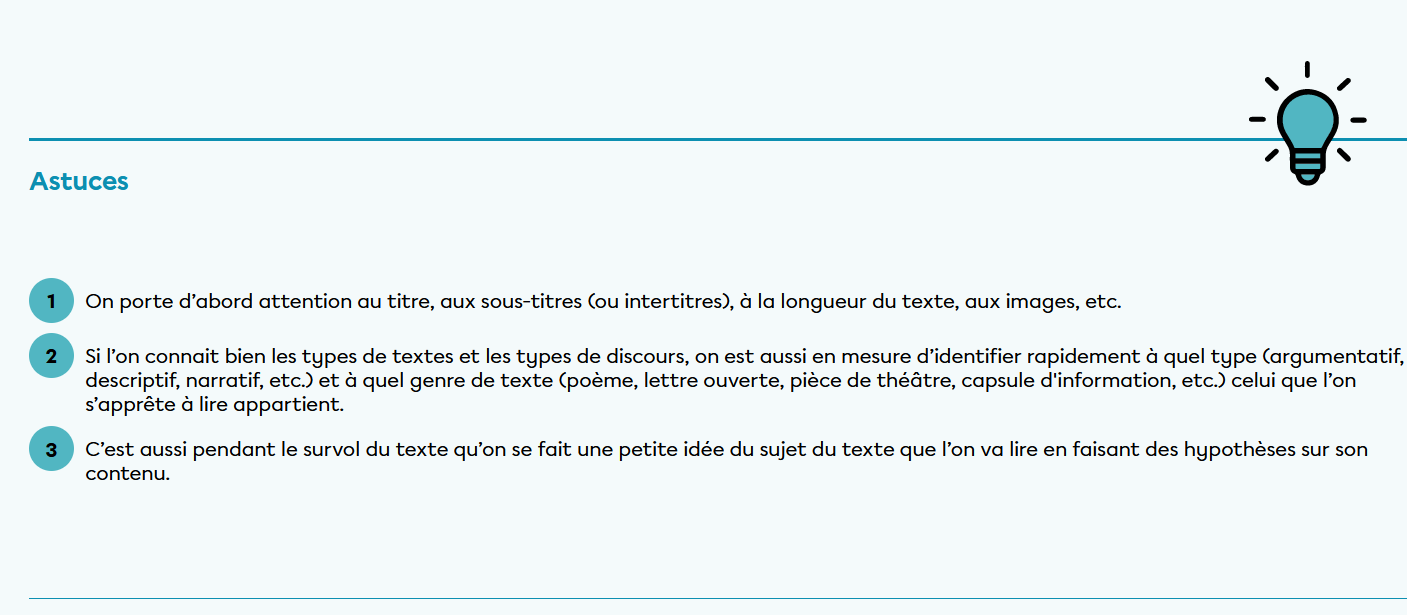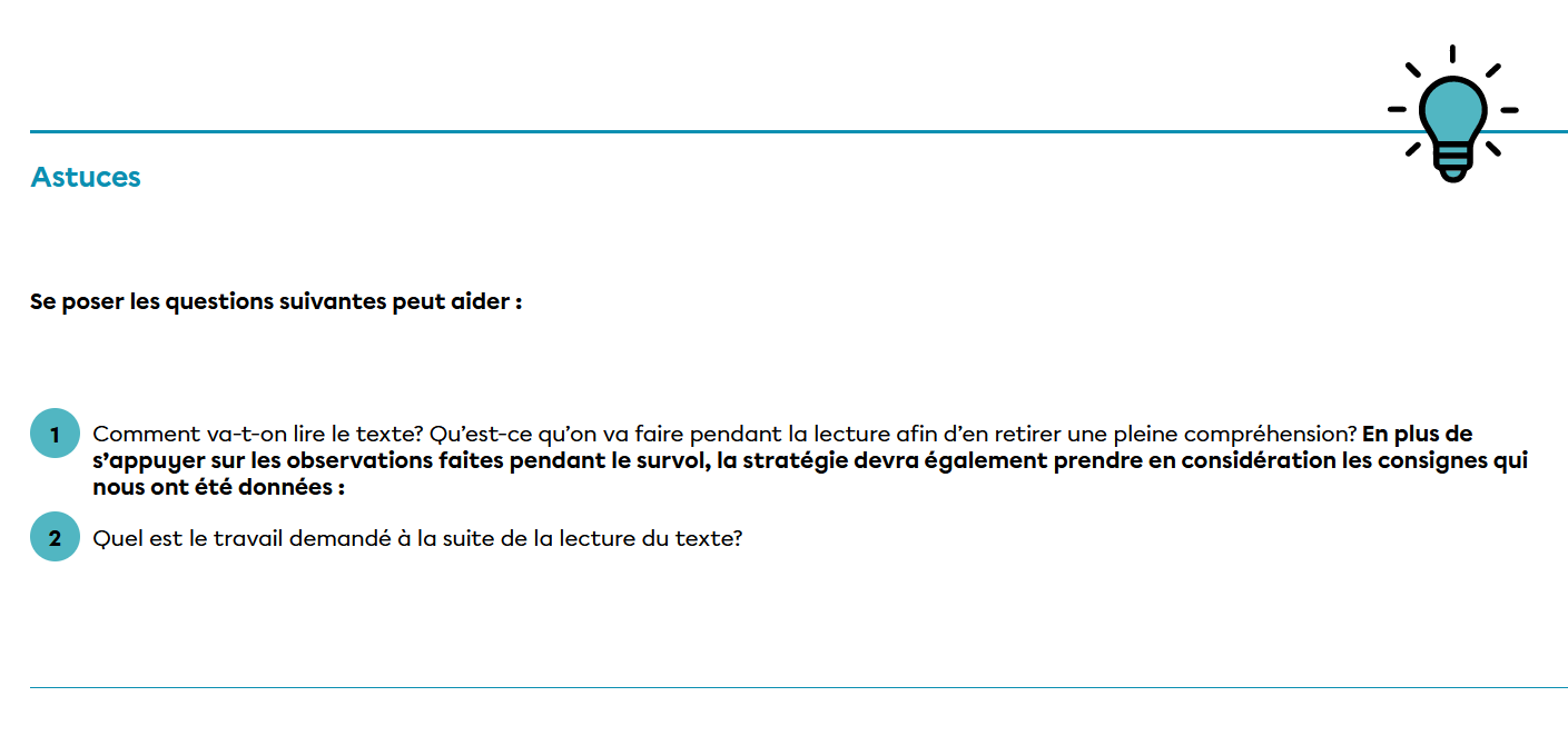 Ensuite, tu dois orienter ta lecture. Qu'est-ce qui sera important à retenir pour l'examen? Habituellement, ton enseignant.e te donnera des consignes à cet effet.