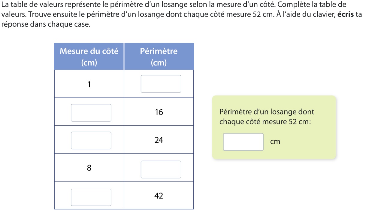 Le périmètre d'un losange, c'est 4 x (mesure d'un côté). Et on suppose, ici, que tous les côtés ont la même mesure.