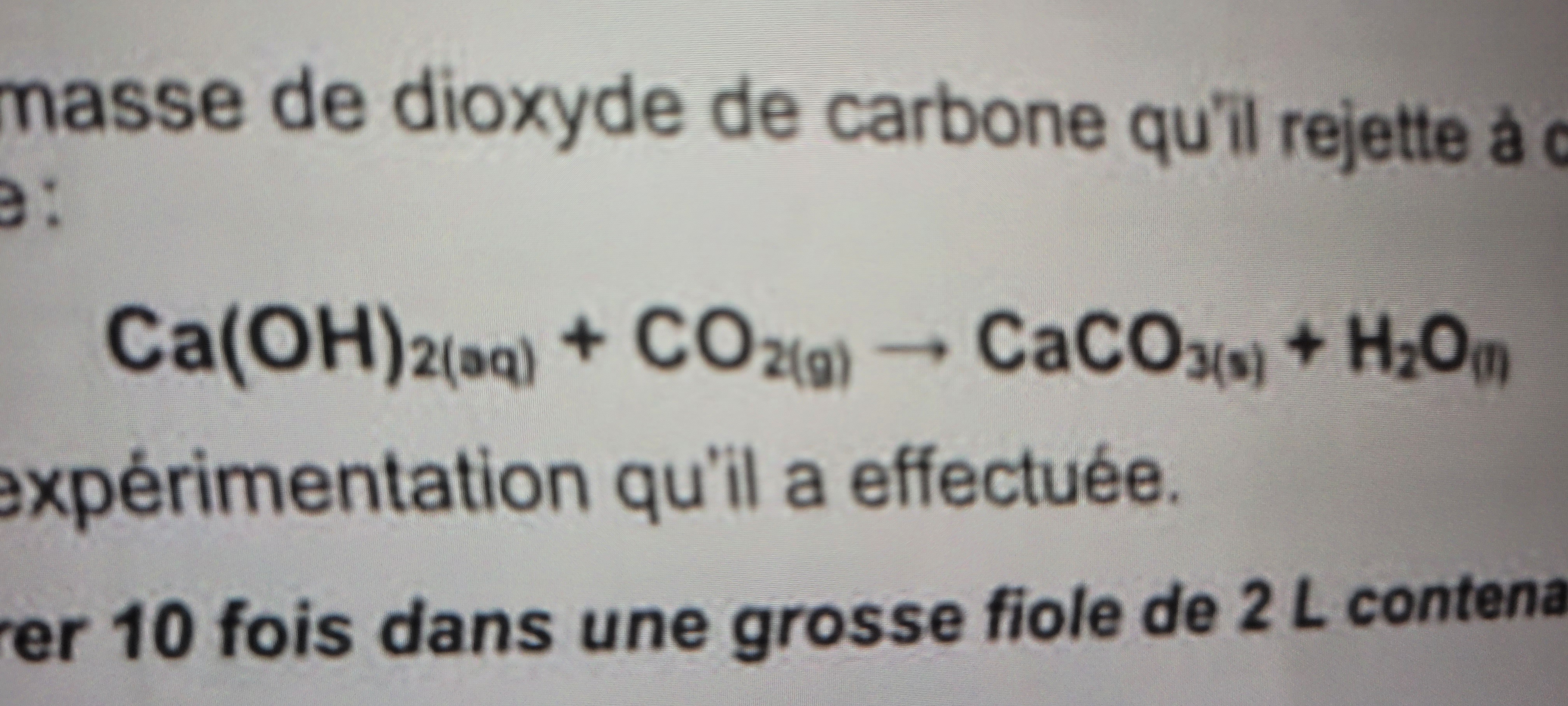 Il s'agit de l'équation qui représente le test de l'eau de chaux. Ce test vérifie la présence de CO2. Le CO2 réagit avec le Ca(OH)2 pour former un précipité blanc, le CaCO3, ce qui rend la solution trouble.