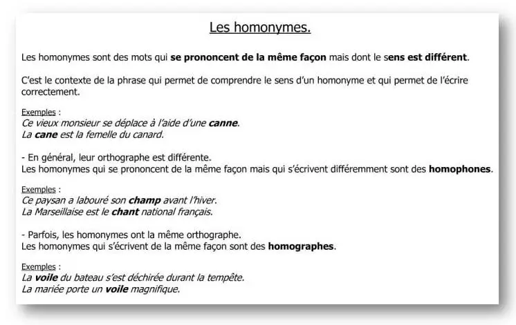 des homographes : mots homonymes qui s'écrivent, se prononcent ou non de la même manière, mais n'ont pas le même sens. Les poules du couvent couvent. des homophones : mots homonymes qui se prononcent de la même manière mais n'ont ni le même sens ni la même orthographe. Il se dirige vers le mur vert au fond de la salle.