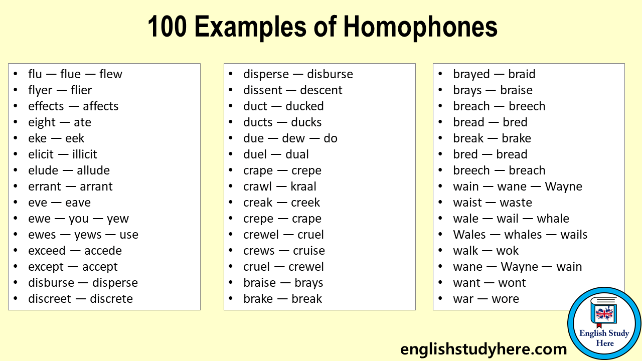 Les homophones sont des mots qui se prononcent de la même manière, mais qui s'écrivent différemment. Voici des exemples :