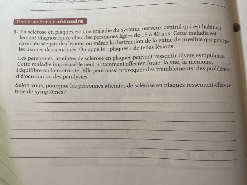 Les gaines de myéline entourant les axones permettent de favoriser la conduction des influx nerveux dans les neurones. Lorsque ces gaines sont détruites, la transmission des influx se fait moins rapidement et donc moins efficacement, ce qui peut créer des problèmes de motricité ou des sens.