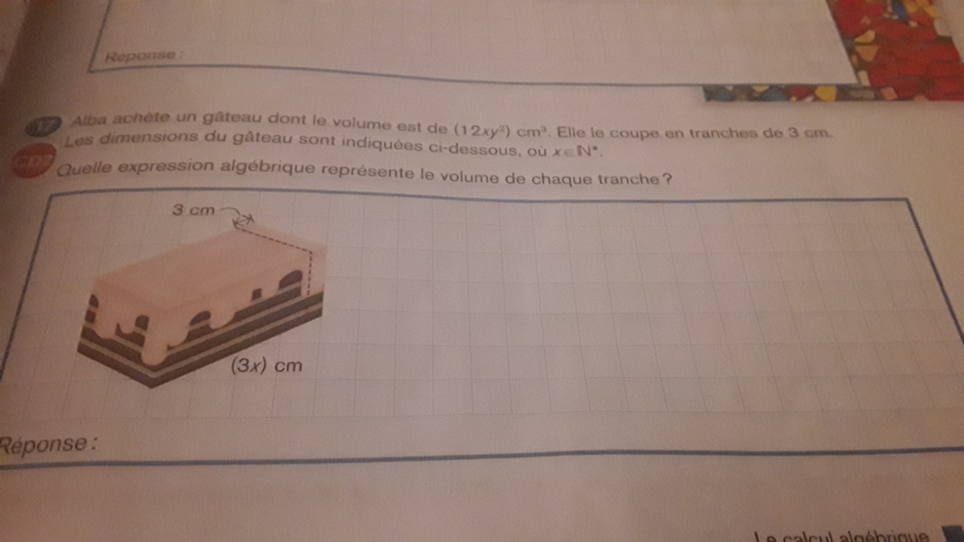 Le V est 12xy^2. La formule pour trouver ce volume est A base x H du prisme. Quel est le type de prisme ? Ceci t'aidera à trouver la mesure du coté de la base que tu as besoin pour le volume de chaque tranche.