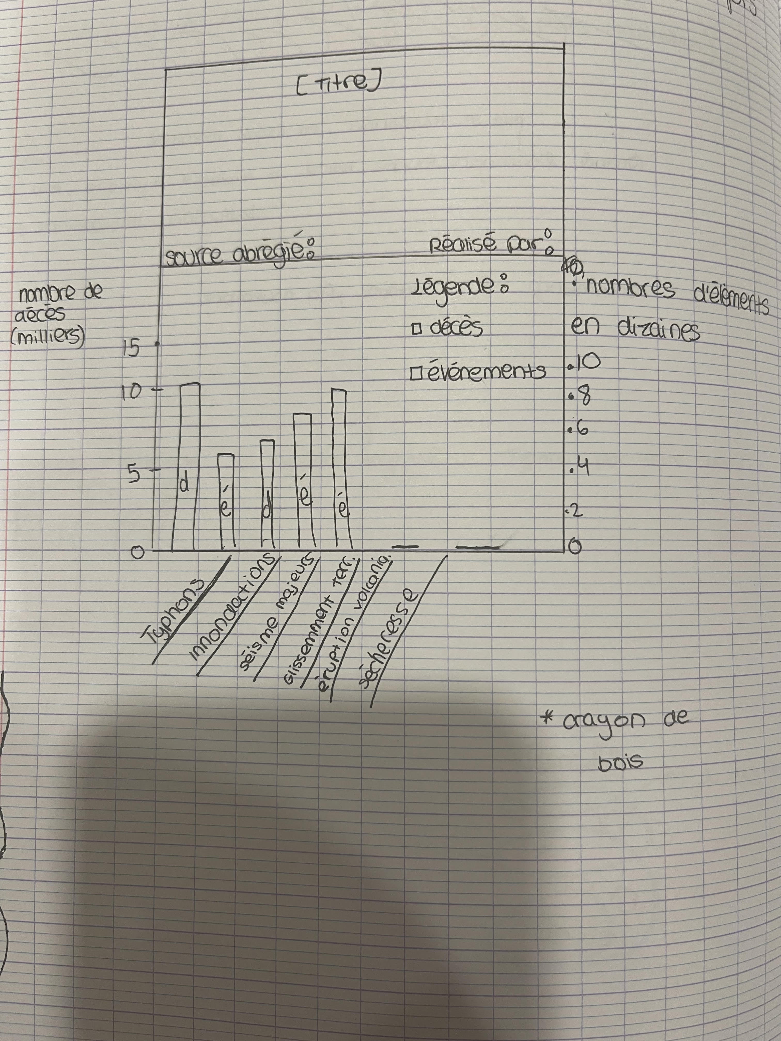 Bonjour Alloprof, alors j'ai un graphique à bande (verticale) à faire, à propos des catastrophes naturels aux Philippines entre 2008 et 2018 à rendre pour ce mardi. Dans mon graphique il doit y avoir les nombres de décès en milliers, les nombres d'événements en dizaines, la légende dont les décès et les évènements. Le problème est que j'ai de la difficulté a le créer.