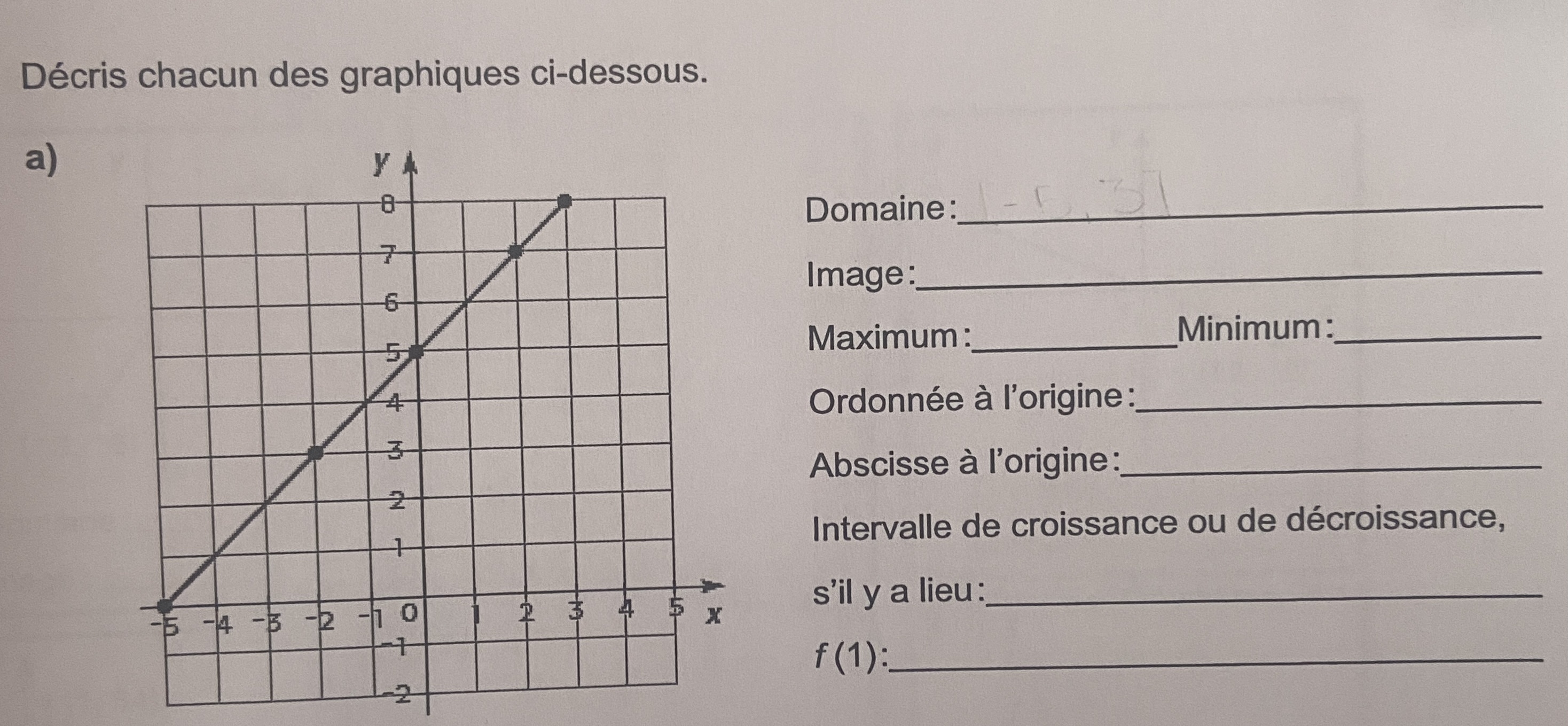 Salut je sais pas si cela va t’aider en tout cas j’espère ! Mais on trouve le domaine sur la ligne des X ces des plus petites coordonnées au plus grand.. Ces le meme concept pour l’image mais avec la ligne des Y a la vertical pour le maximum et minimum ces la variable la plus grand ou la plus petite pour l’ordonné à l’origine ces pour l’axe des Y et ces le point qui touche à ton axe même chose pour l’abscisse à l’origine mais pour les X cette fois j’espère sa y’a aider :)