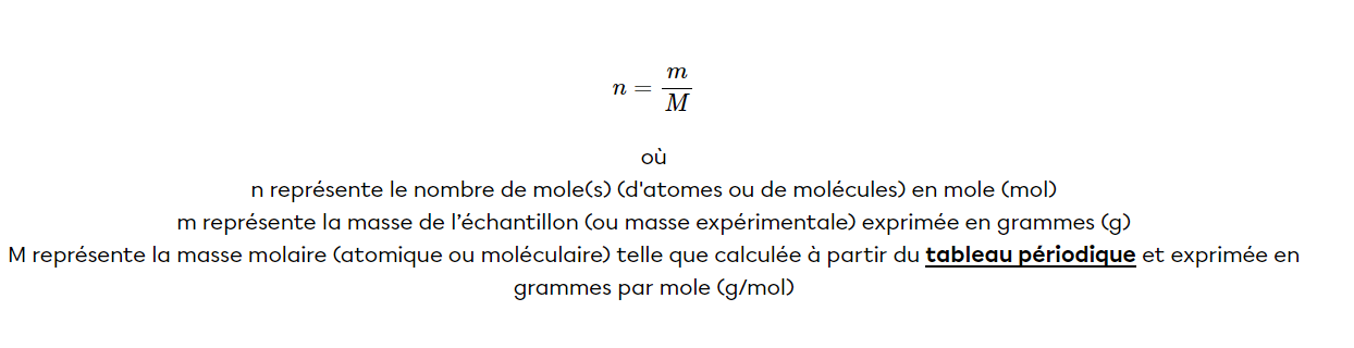 Tu dois d'abord trouver le nombre de moles avec cette formule :
