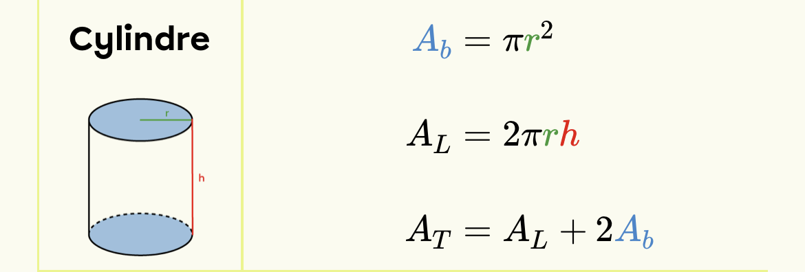 Tout d’abord, nous devrons utiliser la formule d’aire d’un cylindre, soit :