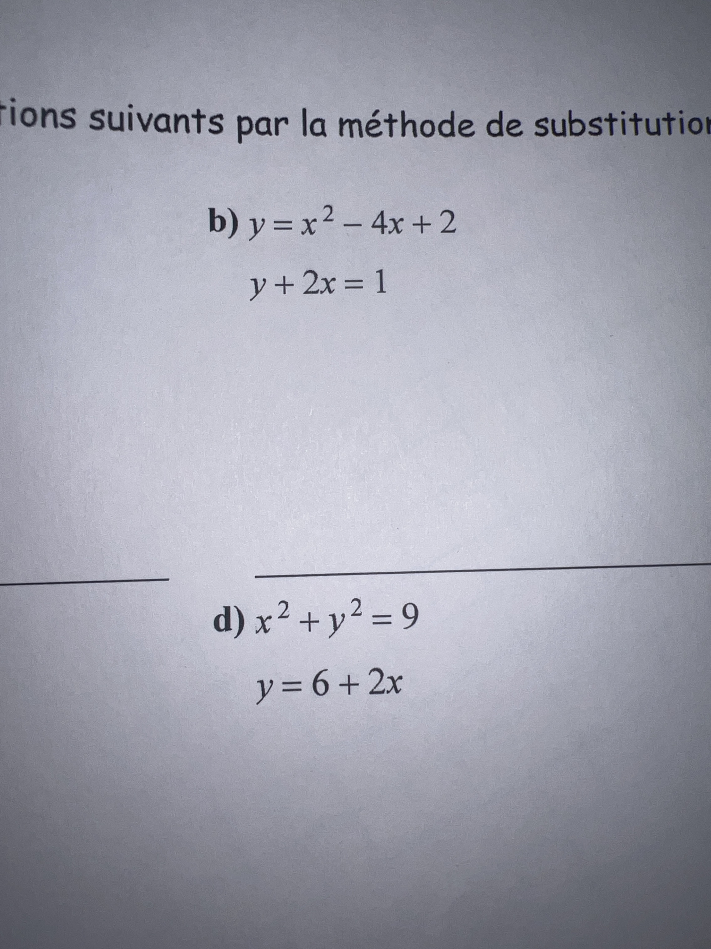Même chose pour le numéro d), tu n'as pas besoin d'isoler y dans la première équation, cela reviendrait à utiliser la méthode de comparaison. Tu devras plutôt insérer 6+2x à la place de la variable y dans la première équation