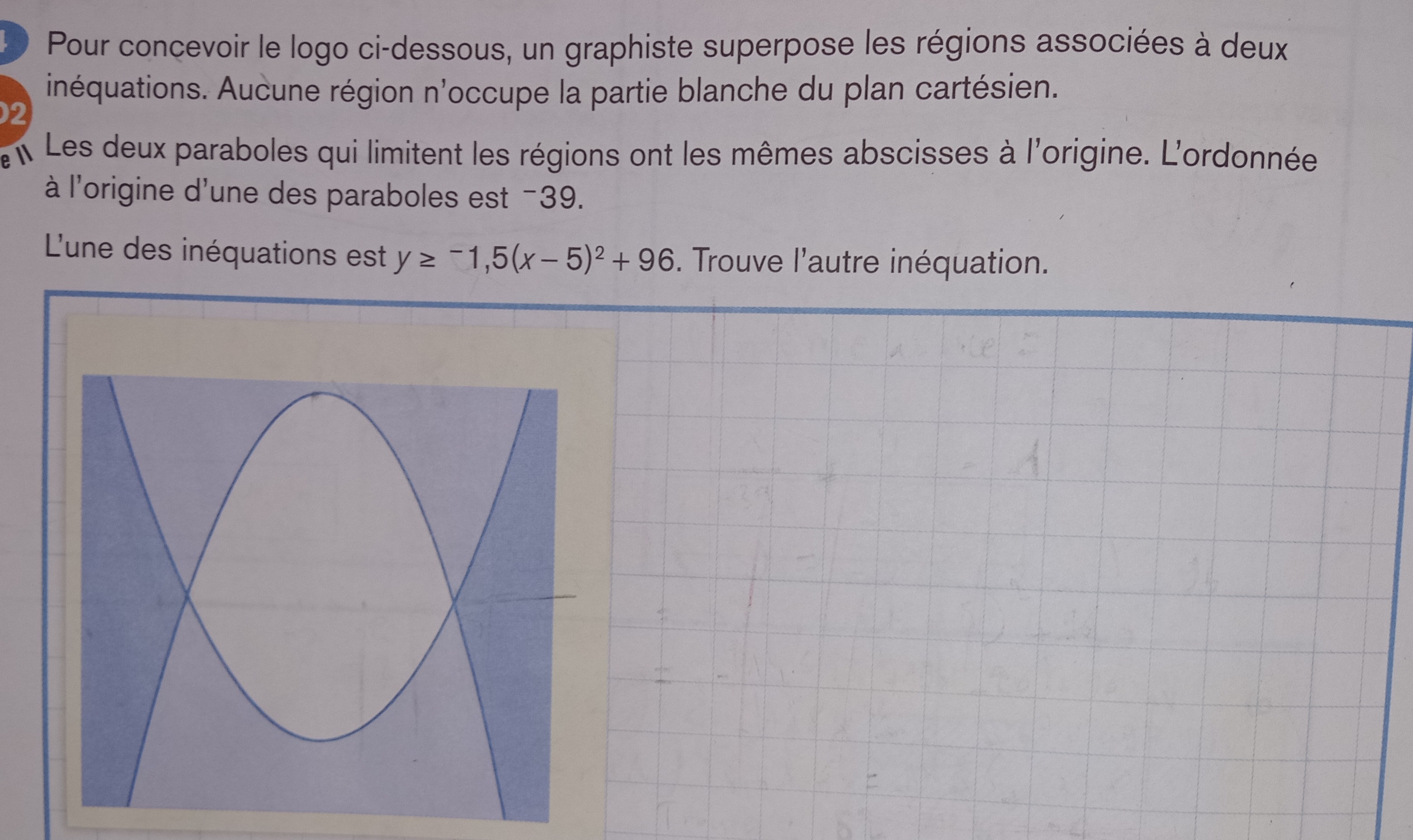 Pour trouver l'inéquation de la 2e parabole, on peut déterminer ses deux abcsisses, et on a son ordonnée à l'origne qui est égale à -39. On peut déduire que -39 est l'ordonnée à l'origine de l'inéquation inconnue parce que pour la 1re inéquation, si x=0, alors y≠-39.