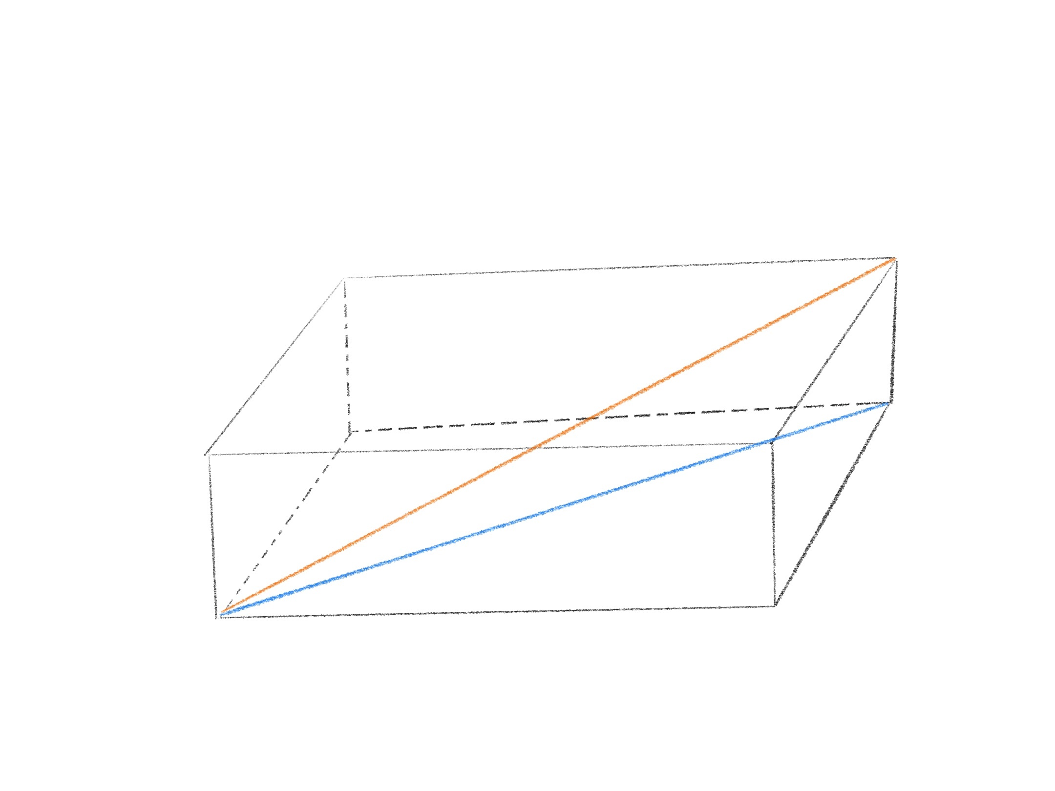 Pour la première question, on te demande de trouver le plus long crayon qui pourrait entrer dans cette boîte. On devra trouver la diagonale de cette boîte. Pour ce faire, tu devras faire deux fois la relation de pythagore; une fois pour trouver la diagonale en bleu sur le dessin et l'autre pour trouver la diagonale orange sur le dessin. Pour trouver la diagonale bleue, tu devras utiliser la mesure de longueur et de largeur de la boîte. Pour trouver la diagonale orange, tu devras trouver la mesure de diagonale bleue et la hauteur de la boîte!