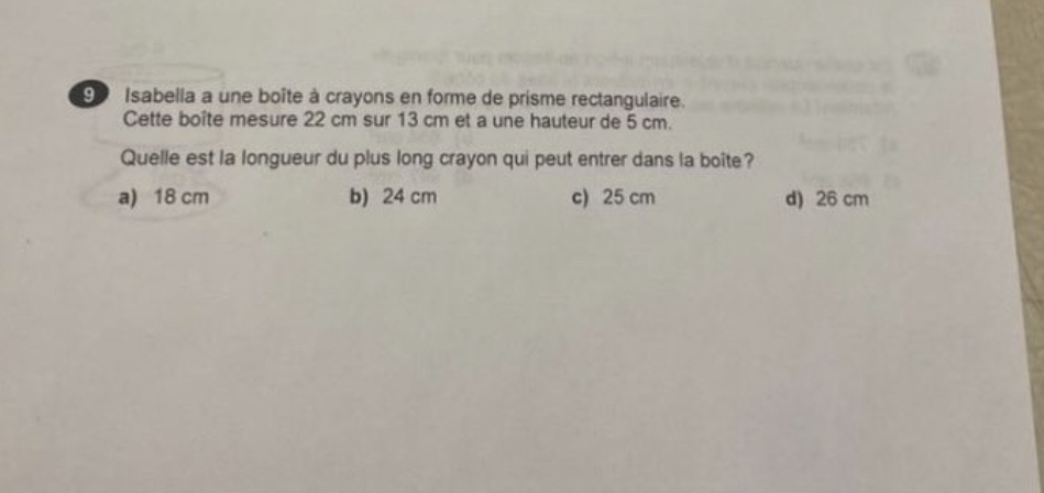 Pour la question 9, il te donnent la longueur de la boite (22cm) et te demande quel longueur de crayon que tu pourrais rentrer. Donc, ta réponse est le nombre plus petit que 22cm