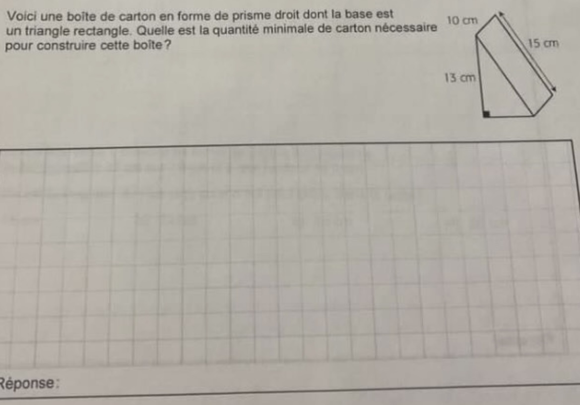 Pour la dernière question, trouve l'aire de chaque face (sauf la base) avec la largeur et l'hauteur qu'il te donnent et ensuite trouve l'aire de la base en faisant pythagore avec le 13cm et le 15cm, additionne ensuite celle-ci à l'aire de tes 3 autres faces.