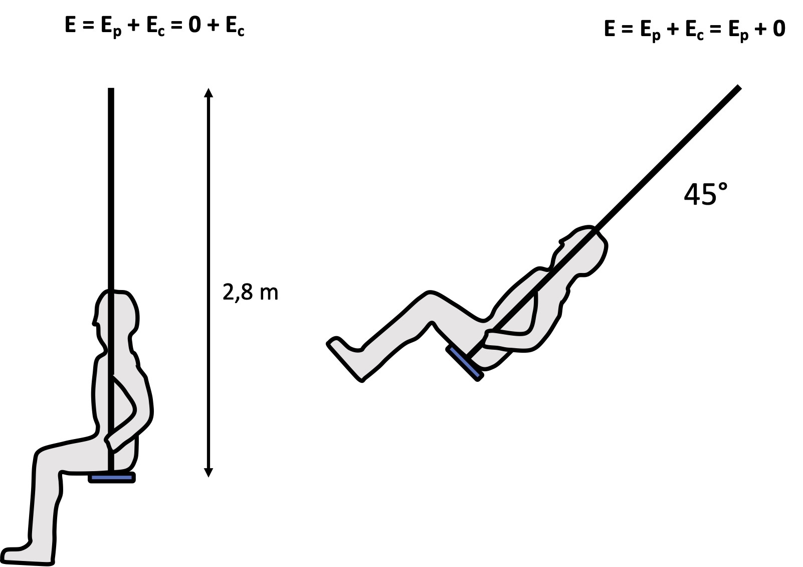 Considérant que l'énergie mécanique est conservé à travers le déplacement de l'enfant, tu peux considérer que Ep lorsque l'enfant est à son angle maximal = Ec lorsque l'enfant est à son point le plus bas. De cette manière, tu pourras isoler la variable de la vitesse dans l'équation finale :