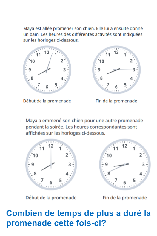 Pour commencer, il faut que tu calcules le temps que chaque promenade a duré en utilisant les informations que l'horloge te fournit. Ensuite, tu devras calculer le nombre de minutes qu'ils ont passé de plus durant la deuxième promenade.