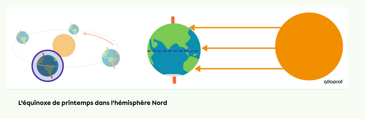 À ce moment, l'hémisphère Nord reçoit autant d'énergie solaire que l'hémisphère Sud. La durée du jour et de la nuit sont les mêmes.