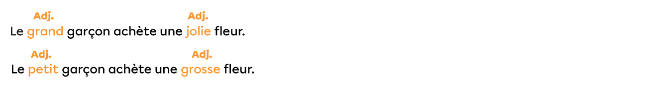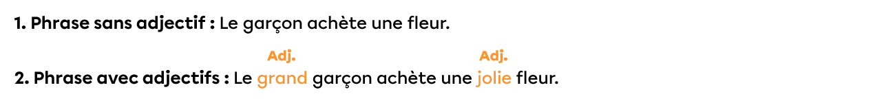 Dans la phrase 1, tu sais que le garçon achète une fleur. Dans la phrase 2, les adjectifs ajoutés précisent que le garçon est grand et que la fleur est jolie.