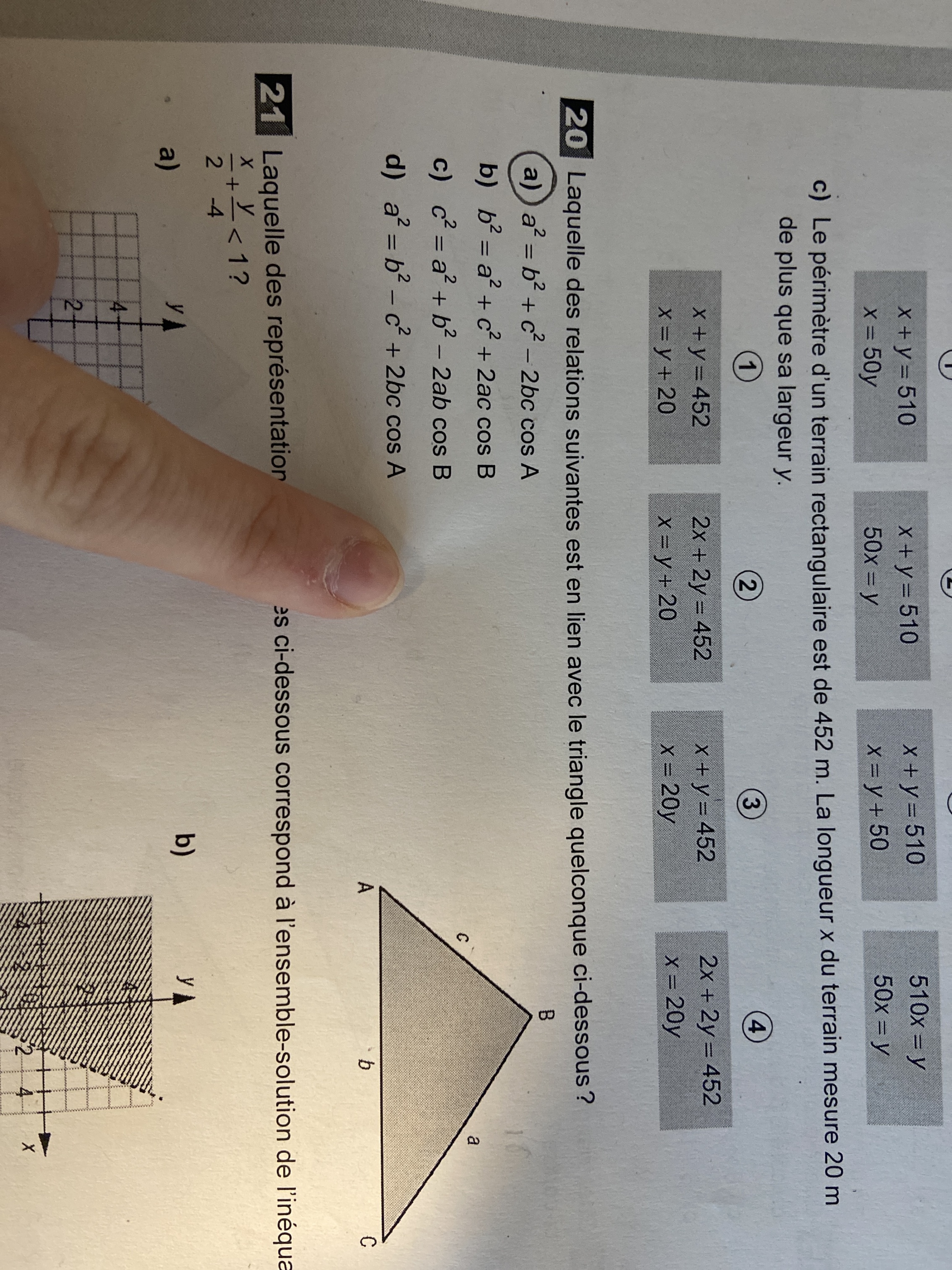 Si tu te réfères à la loi des cosinus, on peut remarquer que dans tes choix de réponses disponibles, seulement la lettre A est identique à l'une des 3 formes ci-dessous.