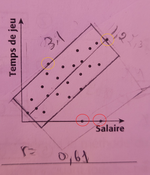 Bonsoir, dans ce graphed ci dessus il y a 2 points aberrant, plus précisément c est une anomalie, donc on compte pas les points dans le rectangle, mais j ai eue comme coefficient de corrélation 0.61 par contre dans le corrigé c est 0.28, pouvez vous me corrigez s'il y a une des affirmations que j'ai dit qui est fausse, merci bcp.