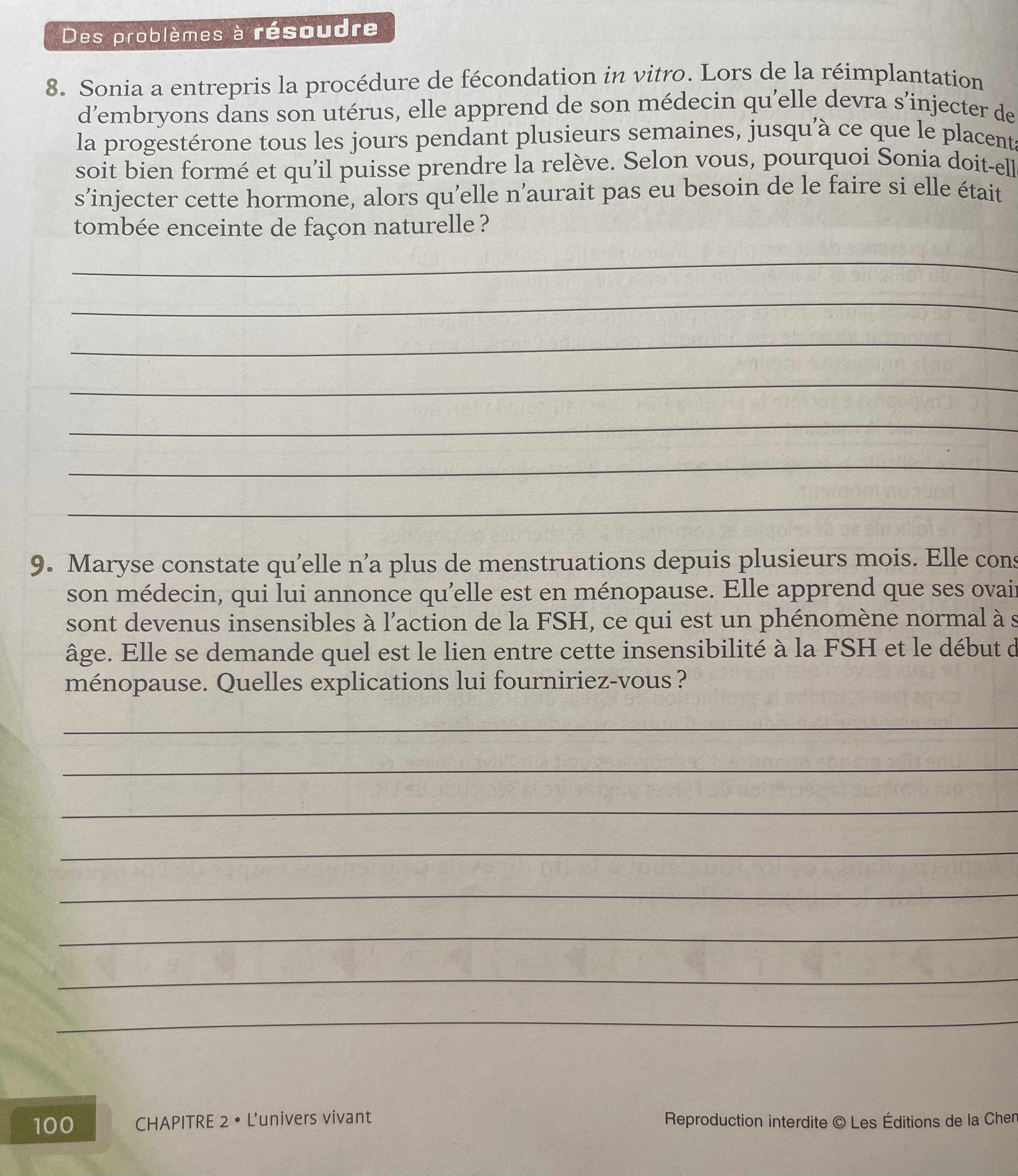 À la question 8, on peut se rappeler que lorsque l'ovocyte est fécondé, le corps jaune se maintient. Tu peux donc réfléchir aux hormones sécrétées par le corps jaune pour répondre à la question!