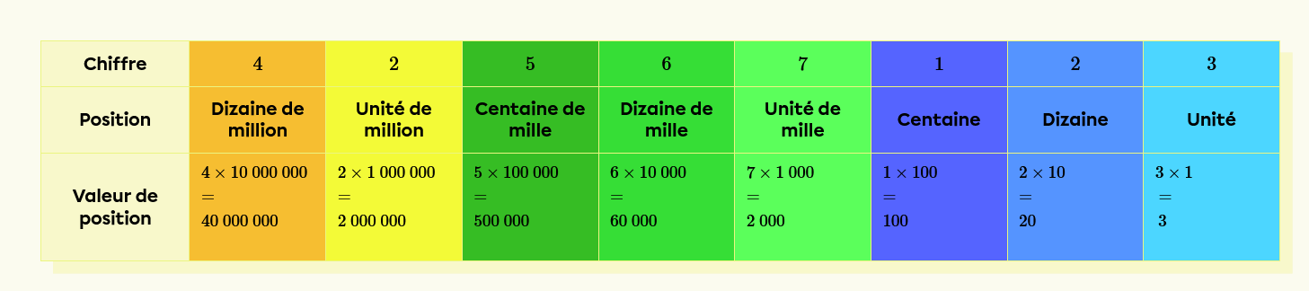 Voici un tableau résumé des positions des chiffres.