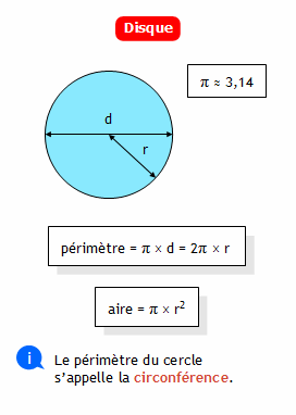 L'aire du disque est l'aire du cercle, la surface en bleue dans cette illustration :