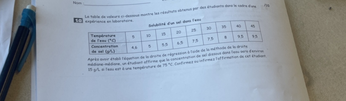 Premièrement, tu vas devoir faire la moyenne de litre d'eau utilisé pour toutes les données qu'ils te donnent. Pour ce faire, tu vas devoir diviser le nombre de kilolitres par le nombre de tonnes. Ensuite, tu vas additionner tous les résultats obtenus. Après, tu va diviser le tout par le nombre de nombres que tu as additionner (dans ce cas 9). Ce nombre va te donner la moyenne d'eau utilisé pour une tonne, donc tu vas simplement le multiplier par 13, car tu veux savoir le nombre de litre pour 13 tonnes. Ensuite, tu vas transformer ce nombre (qui est en kilolitres) en litres en multipliant par 1000. Finalement, tu vas multiplier le nombre obtenu avec le prix de l'eau par litre pour trouver la réponse. Voici une fiche pour t'aider avec la moyenne : https://www.alloprof.qc.ca/fr/eleves/bv/mathematiques/la-moyenne-m1353